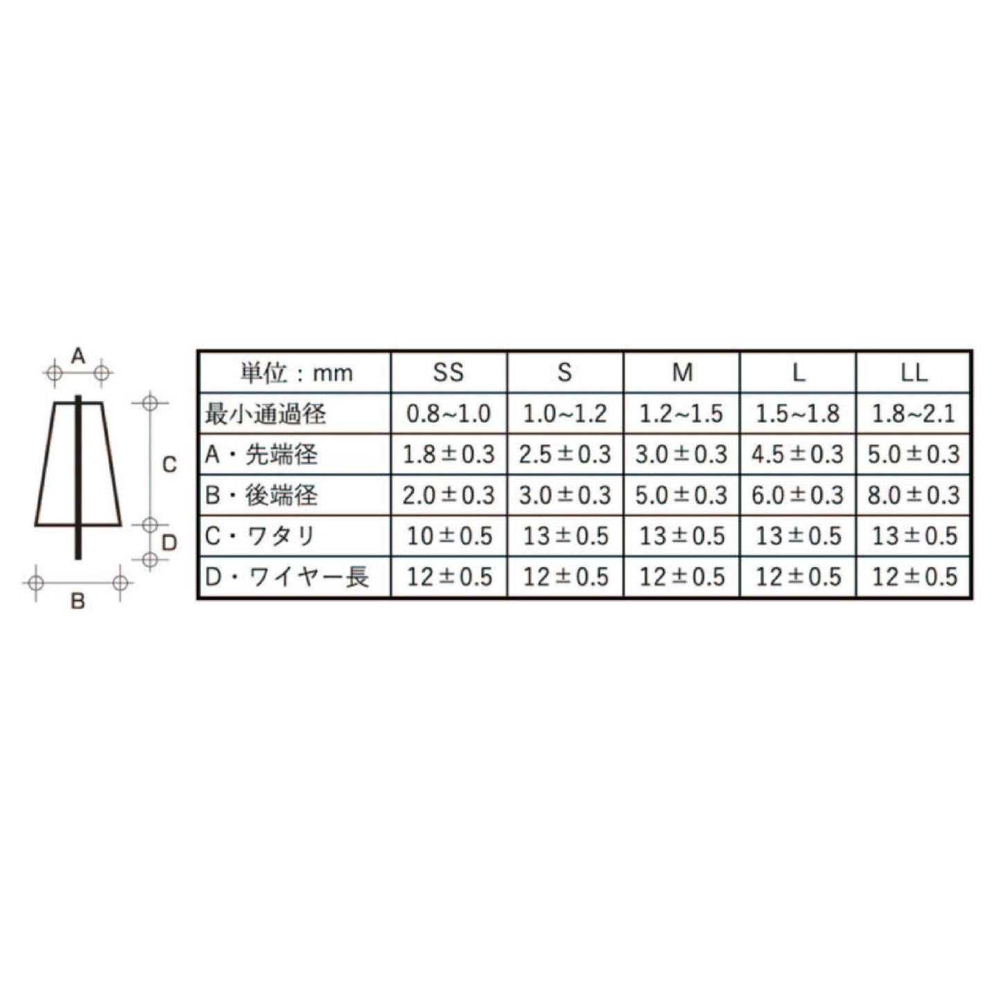 Material・Dimensions / Hair: Nylon (Diameter 2.5 mil), Wire: Stainless Steel (Diameter 0.3 mm), Minimum Passage Diameter (1.5~1.8 mm)