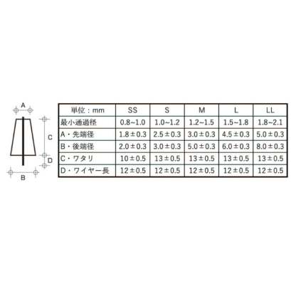 Material・Dimensions / Hair: Nylon (Diameter 2.5 mil), Wire: Stainless Steel (Diameter 0.28 mm), Minimum Passage Diameter (1.2~1.5 mm)